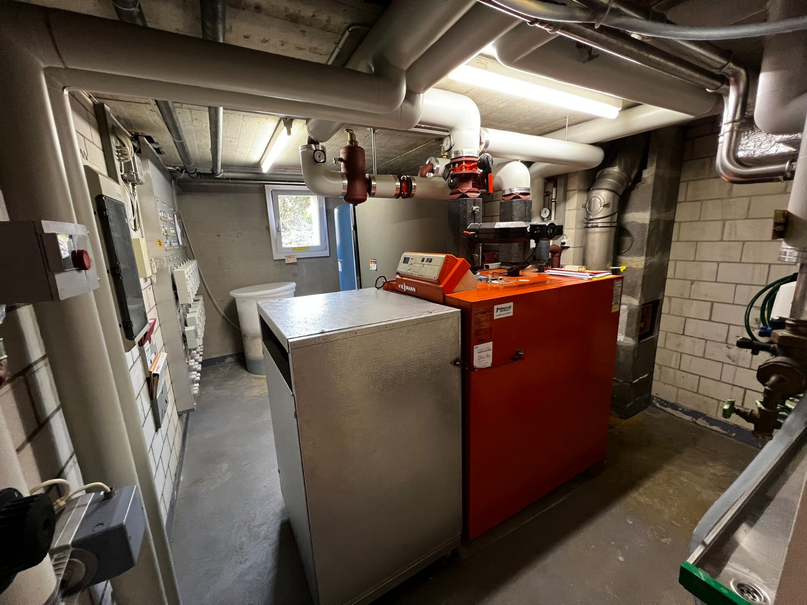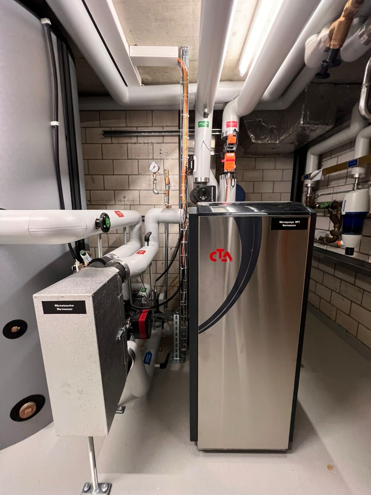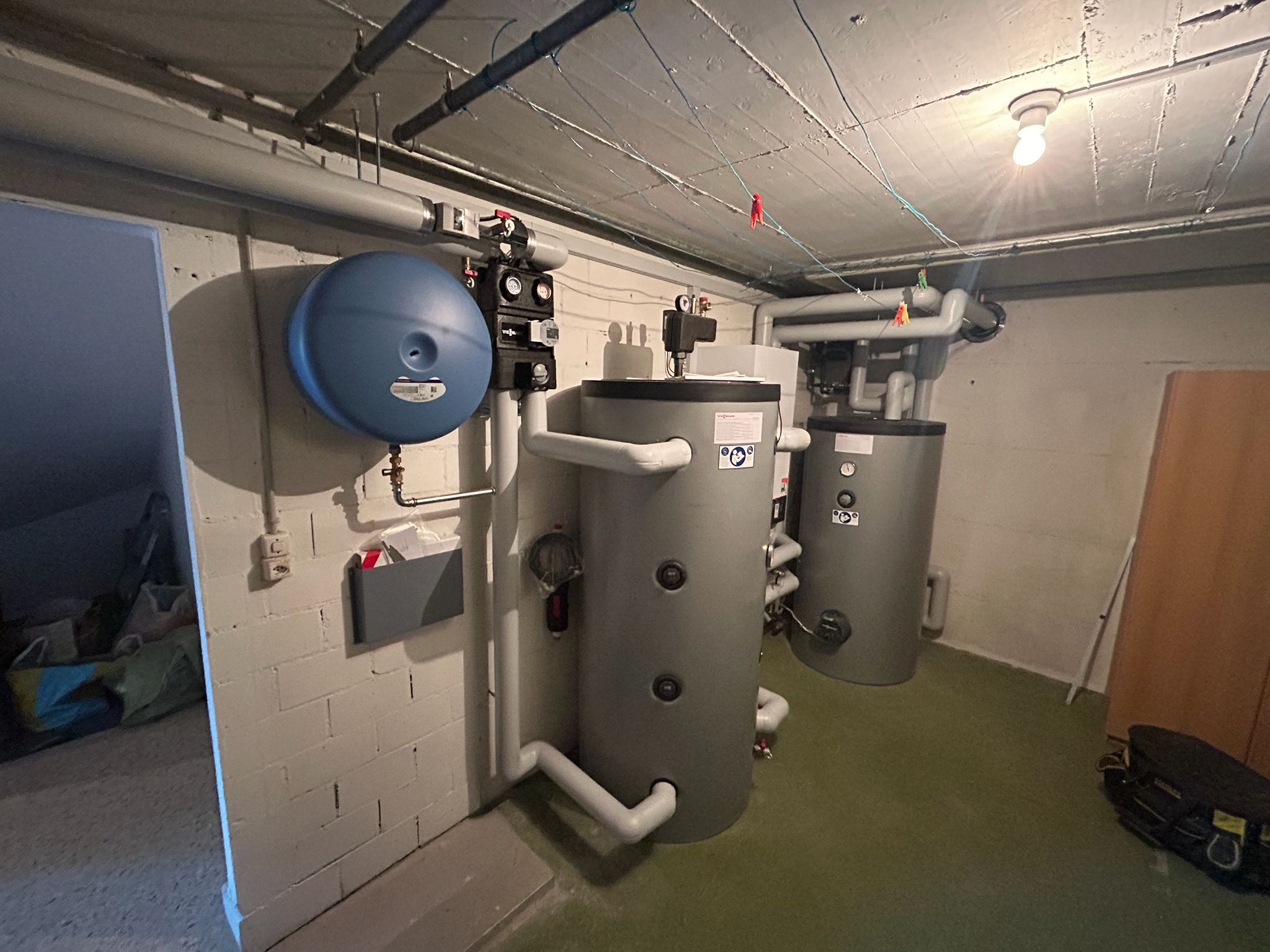 Im Rahmen eines umfassenden Sanierungsprojekts wurde der bestehende Ölkessel durch eine effiziente Luft‑Wasser‑Wärmepumpe ersetzt. Der neue Luftkühler ist geräuschoptimiert im Aussenbereich installiert. Die Anlage versorgt insgesamt 27 Wohnungen in vier Gebäuden zuverlässig - mit einer Gesamtleistung von 114 kW (78 kW Heizen / 36 kW Warmwasser). Der ehemalige Öltankraum wurde sinnvoll in einen neuen Technikraum umgewandelt. Die frühere Heizzentrale dient nun als Bereich für die Brauchwarmwasseraufbereitung, inklusive eines effizienten Booster-WP-Systems.