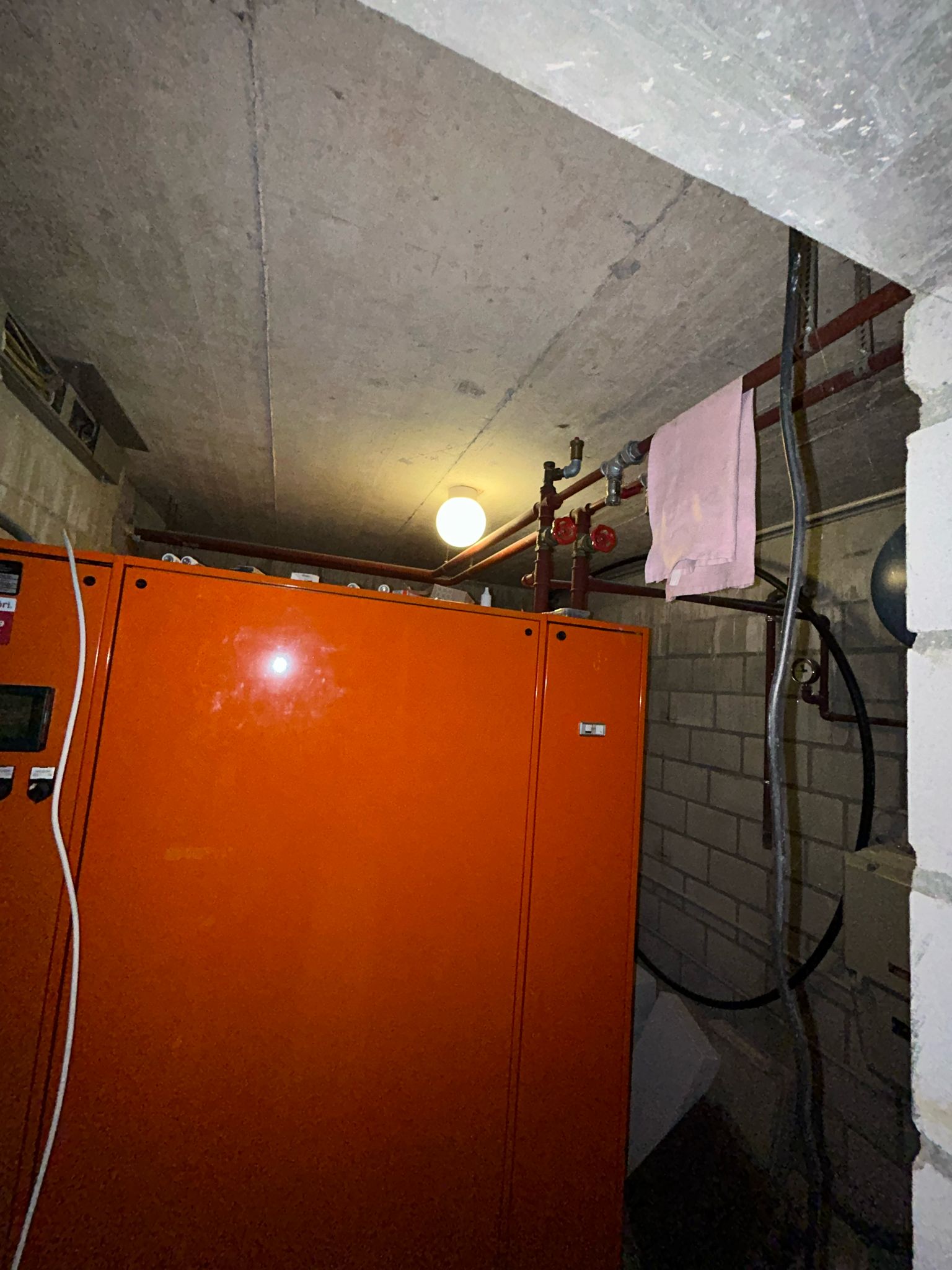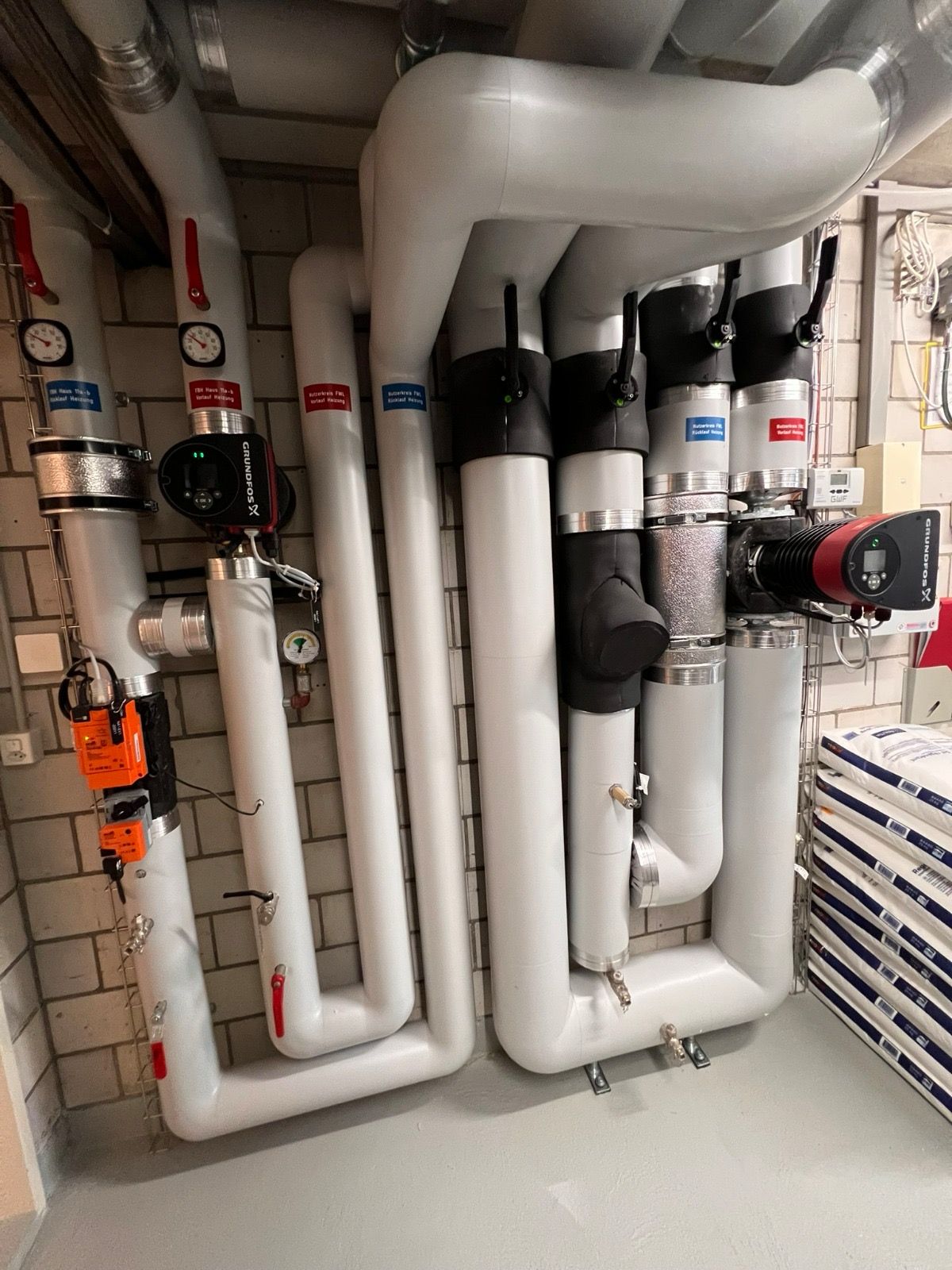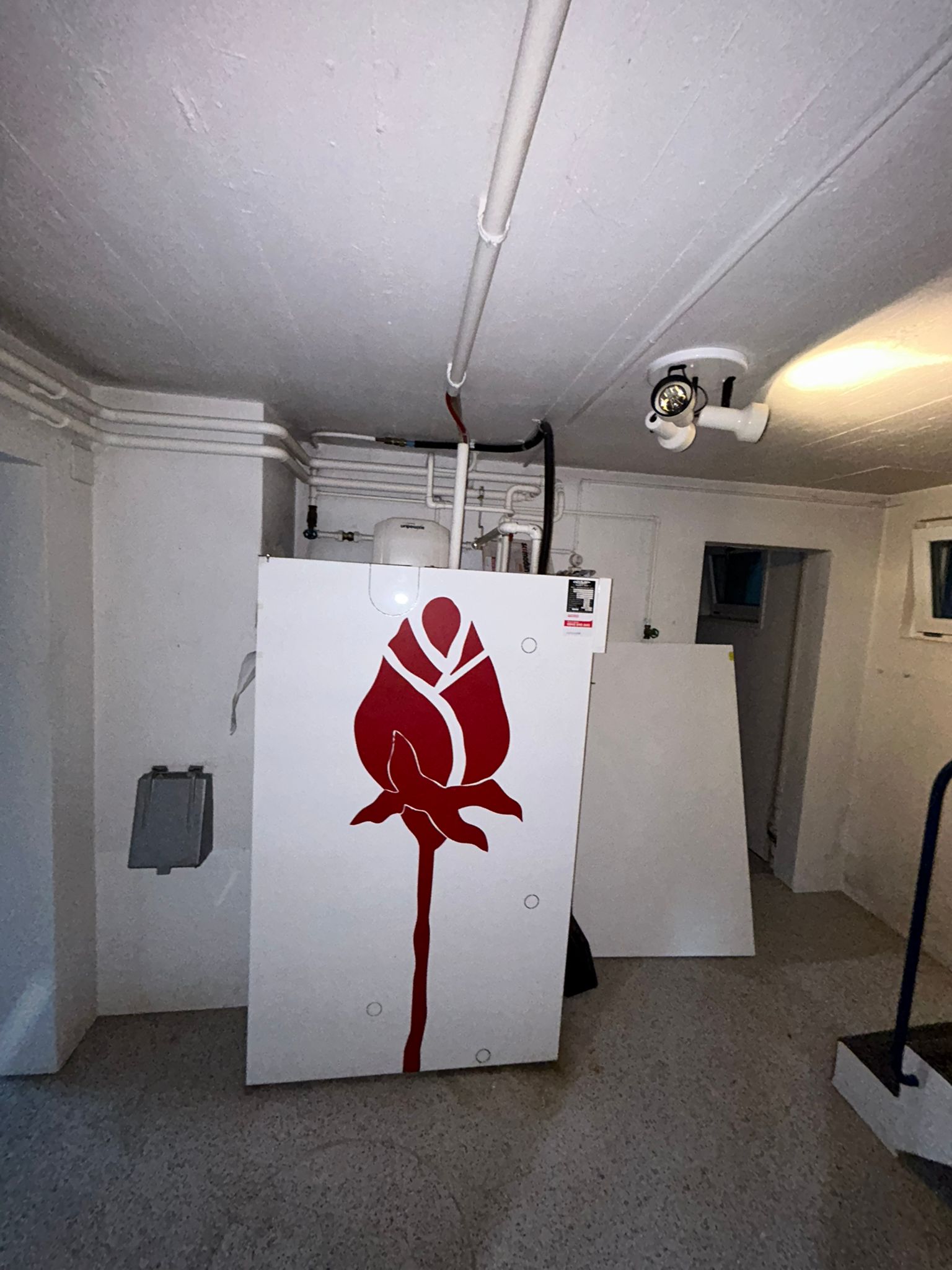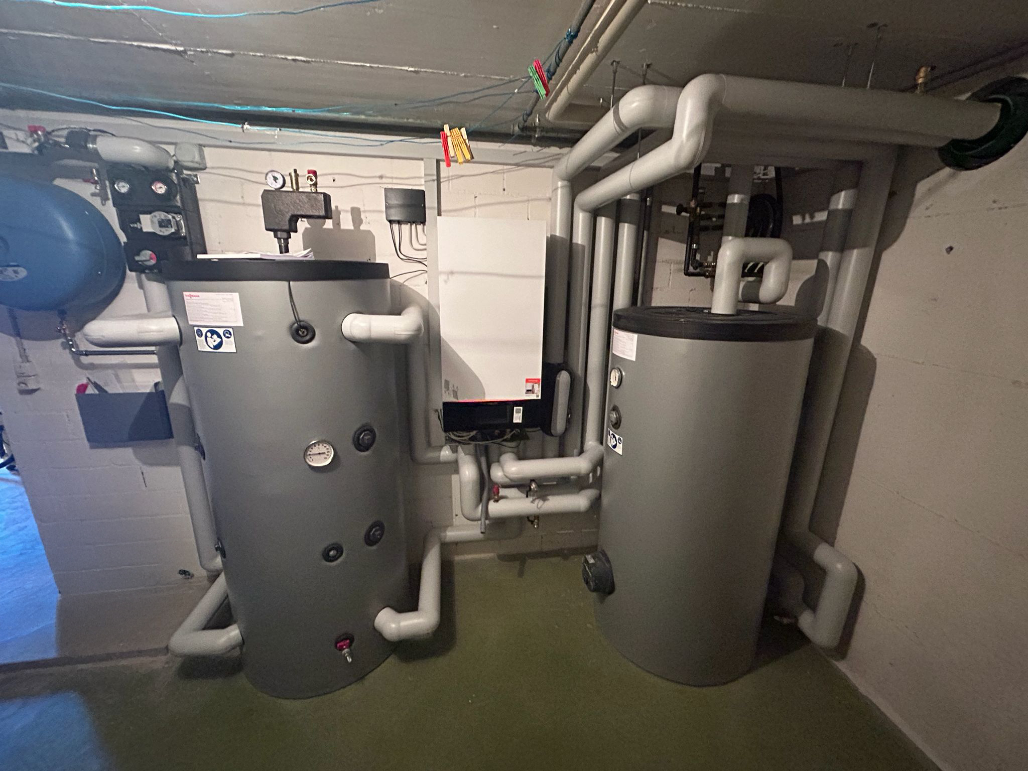 Im Rahmen eines umfassenden Sanierungsprojekts wurde der bestehende Ölkessel durch eine effiziente Luft‑Wasser‑Wärmepumpe ersetzt. Der neue Luftkühler ist geräuschoptimiert im Aussenbereich installiert. Die Anlage versorgt insgesamt 27 Wohnungen in vier Gebäuden zuverlässig - mit einer Gesamtleistung von 114 kW (78 kW Heizen / 36 kW Warmwasser). Der ehemalige Öltankraum wurde sinnvoll in einen neuen Technikraum umgewandelt. Die frühere Heizzentrale dient nun als Bereich für die Brauchwarmwasseraufbereitung, inklusive eines effizienten Booster-WP-Systems.